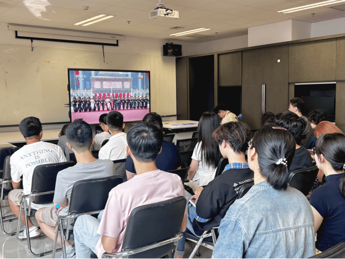2025级研究生本科生在国际大厦1053会议室晨读厅集合,怀着崇敬之心等待大会开启。直播过程中,全体学生全神贯注,认真聆听中共中央总书记、国家主席、中央军委主席习近平发表的重要讲话,专注观看阅兵式与分列式各个环节,共同见证这一庄严时刻。