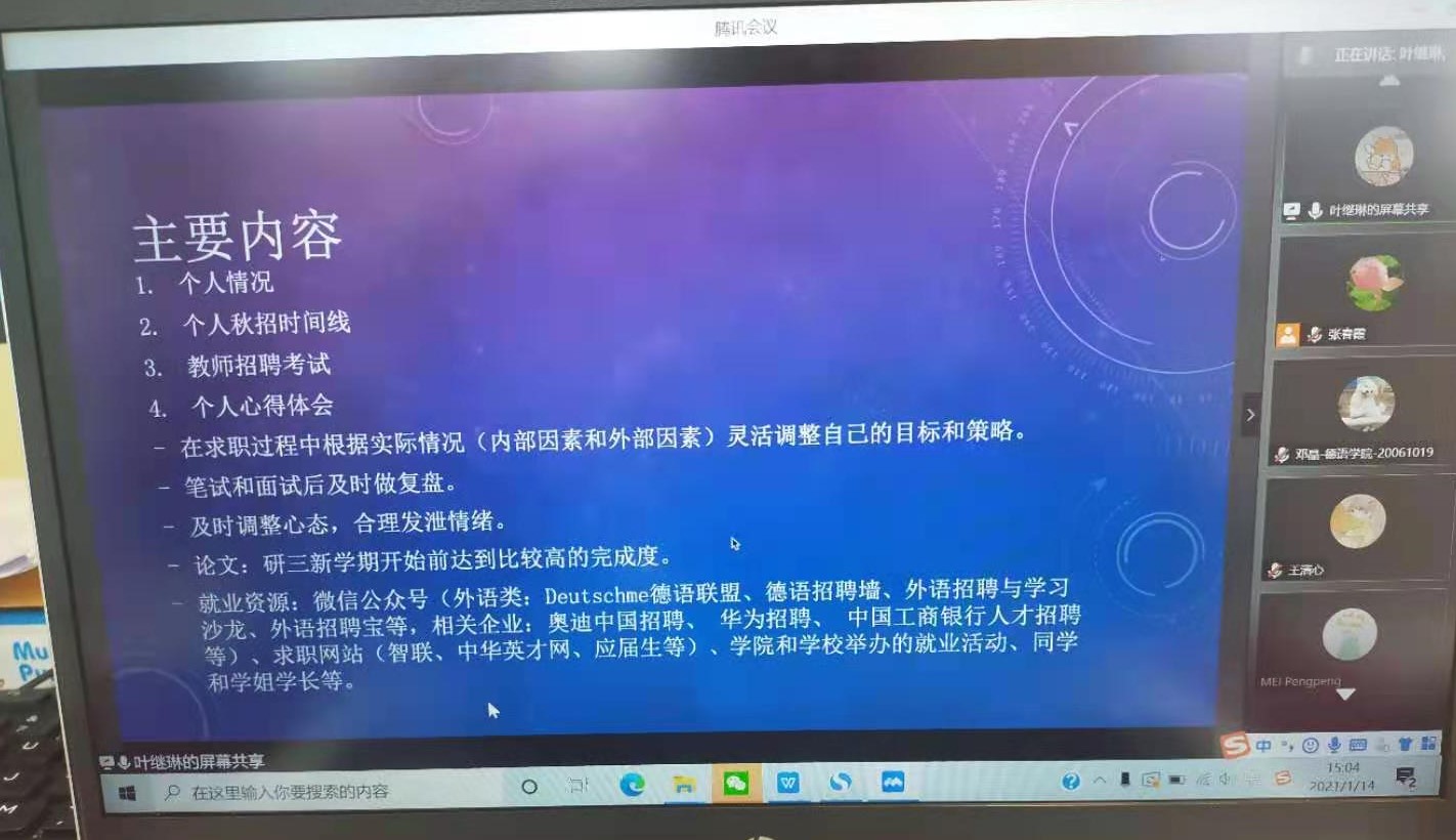 1月14日下午研究生期末会议,60余名研究生在线参加。会议邀请了研三学生张舶航、叶继琳、商健华进行经验分享。他们分别从研究生学业、职业规划,考博、求职经验等方面进行分享。之后辅导员张春霞作了“研究生职业规划”的报告。张春霞老师首先介绍了2020年北外就业质量报告的相关内容,之后对2020届、2021届毕业研究生就业情况和就业形势进行分析,结合用人单位的反馈、毕业生的问卷等对研究生的学业、职业规划提出几点建议,并解答了同学们关于学业、职业等方面的困惑。最后对假期疫情防控、人身财产安全注意事项等进行了布置和要求。