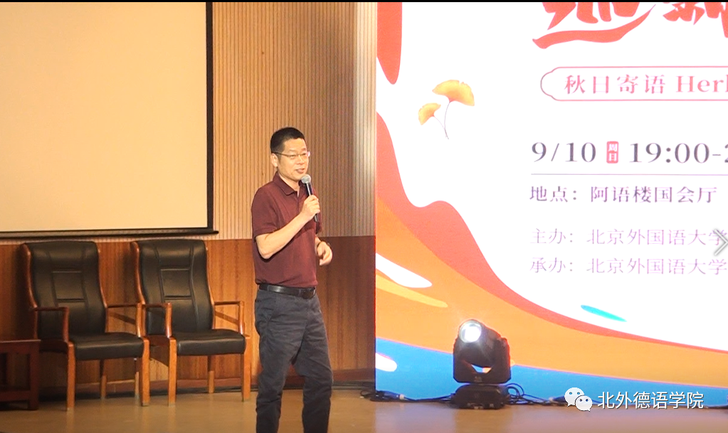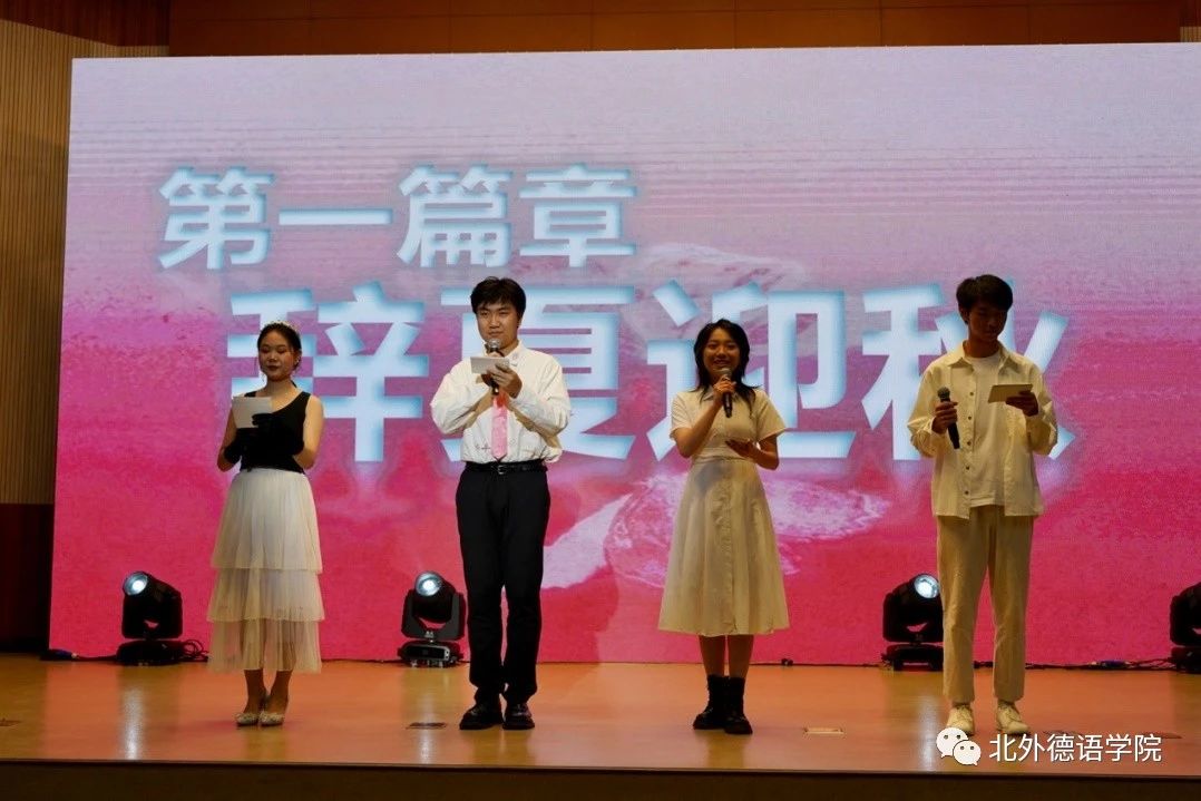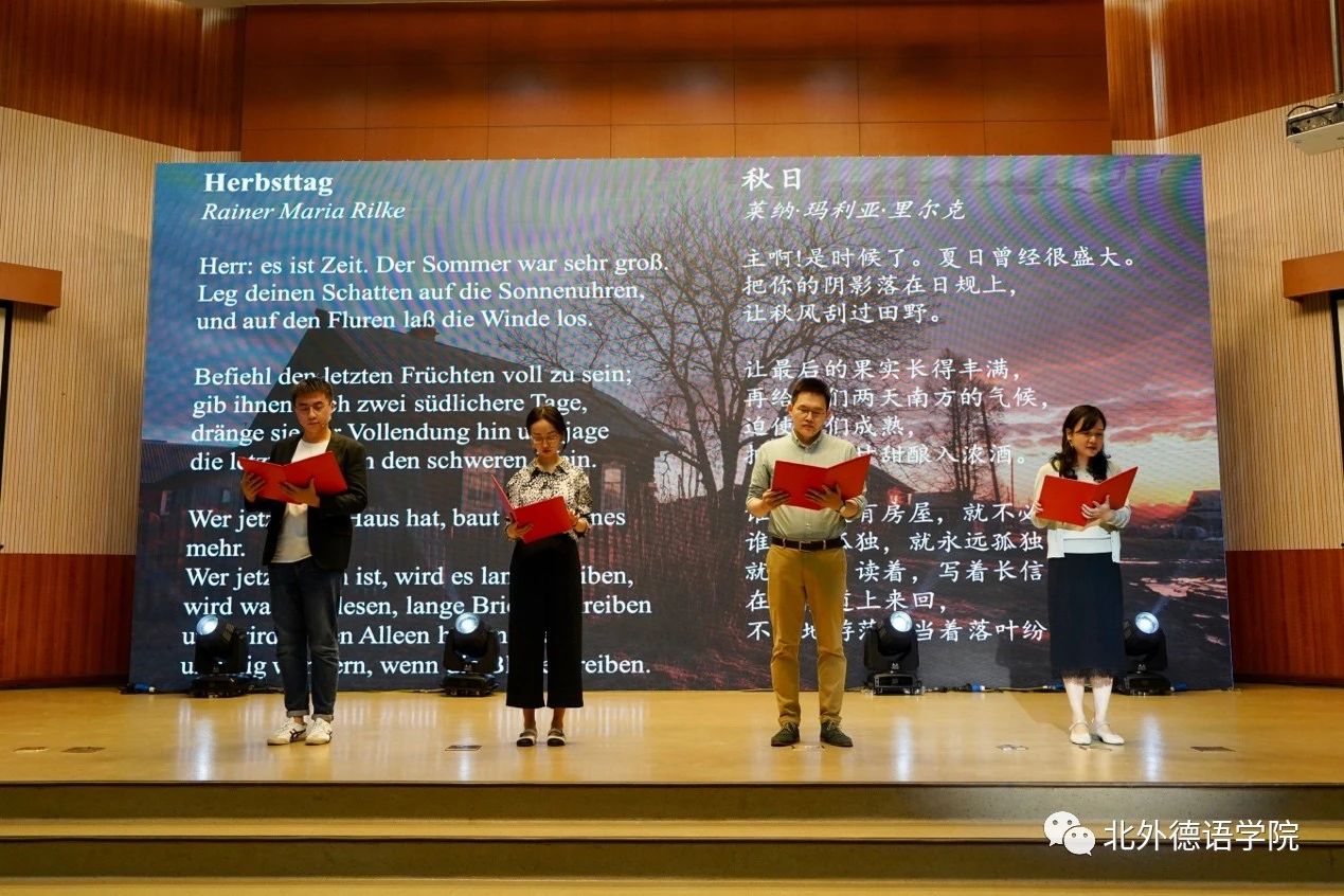 必赢242net官网党总支委员、副院长张晓玲、寇蔻,青年教师武迪,22级硕士生姜浩远四人联袂表演中德文诗歌朗诵《秋日诗语》,朗诵了德国经典诗歌里尔克《秋日》、席勒《希望》和马克思经典著作《青年在选择职业时的考虑》(节选),使新生们感受到了德文之美、中文之妙,经典著作的隽永留香。