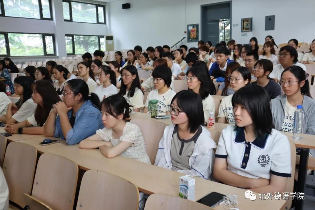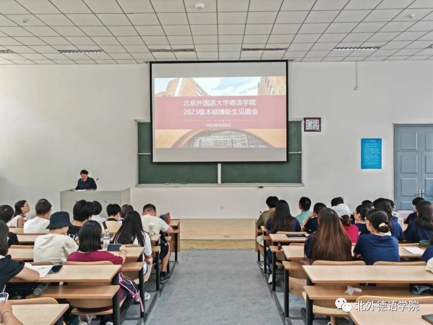 之后,学院党总支以及党政联席会成员先后发言。党总支成员、教学秘书于芳鼓励新生树立新的目标,努力实现梦想;党总支委员、副院长张晓玲、寇蔻勉励新生积极参与学院丰富多彩的各项活动,通过学习德语遇到更好的自己,认识更大的世界,用德语成就梦想,用梦想创造未来!党总支常务副书记李勇引用抗大校训“团结、紧张、严肃、活泼”,希望新生在大学宿舍生活中养成包容差异的生活习惯,搞好团结;在学院和学校的各种集体活动中,在各项校内外竞赛中,团结一致,共创佳绩。保持德语人严谨、认真和细致的好传统作风,勇创新、善突破。保持持之以恒、坚持阅读等良好的微习惯,遇见最好的自己。党总支书记、院长吴江借用汉字“熵”的由来以及管理学提出的实现熵减的三个路径,结合北外必赢242net官网的发展史,勉励2023级本硕博新生保持开放的心态,学会与不同的学科和方向实现“能量交换”,敢于尝试创新远离稳态,秉持“兼容并蓄 博学笃行”的北外校训,开启在北外的晨读和暮思!