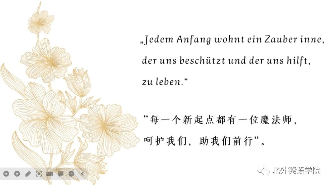 徐四季、李婧和陆娇娇作为教研室主任代表发言,勉励新生勇敢做自己,从北外出发,走向德语国家,在中欧交流的大舞台贡献自己的力量,祝福新生在北外沐浴四季阳光,播撒梦想的种子,合理规划好时间,充分培养兴趣与才干,不负韶华,静待花开;葛囡囡、史良作为班主任代表发言,鼓励新生寻找互帮互助的朋友,结识志同道合的伙伴,在模仿和超越榜样的过程中塑造出独特的自我;洪堃绿、武迪作为青年教师代表发言,祝福新生在北外必赢242net官网度过充实美好的多彩时光,学有所成,开启行走世界的人生新篇章!包葛耿、邱袁炜代表学院行政工作人员发言,希望新生在北外的日子过得开心,每天进步一点点;辅导员张春霞、张婧、黄唯城勉励新生珍惜青春年华,勇攀学业高峰,敢于行走世界,秉承红色基因,成为又红又专又雅的北外德语人,承担起中华民族伟大复兴、构建人类命运共同体的重任。