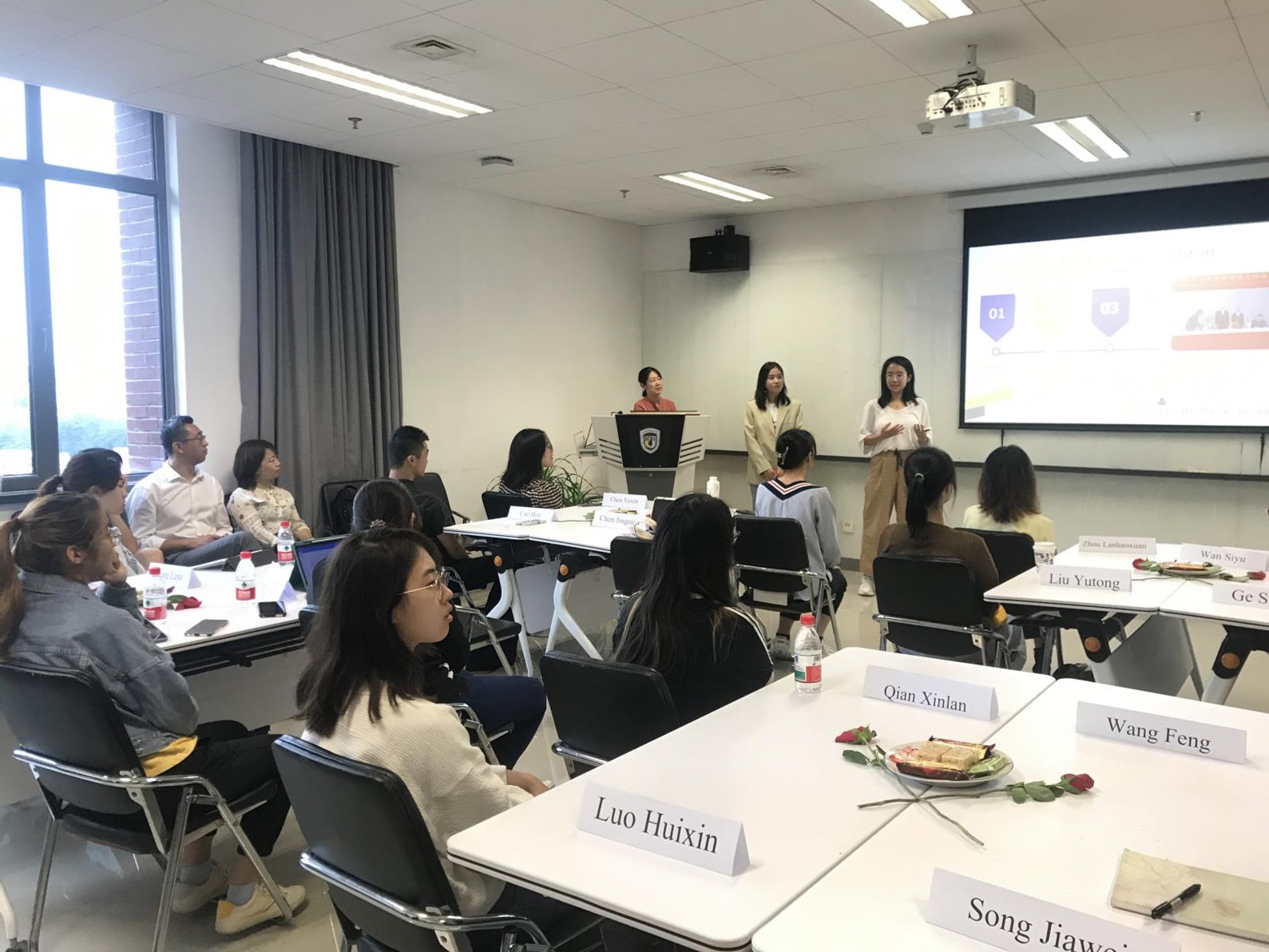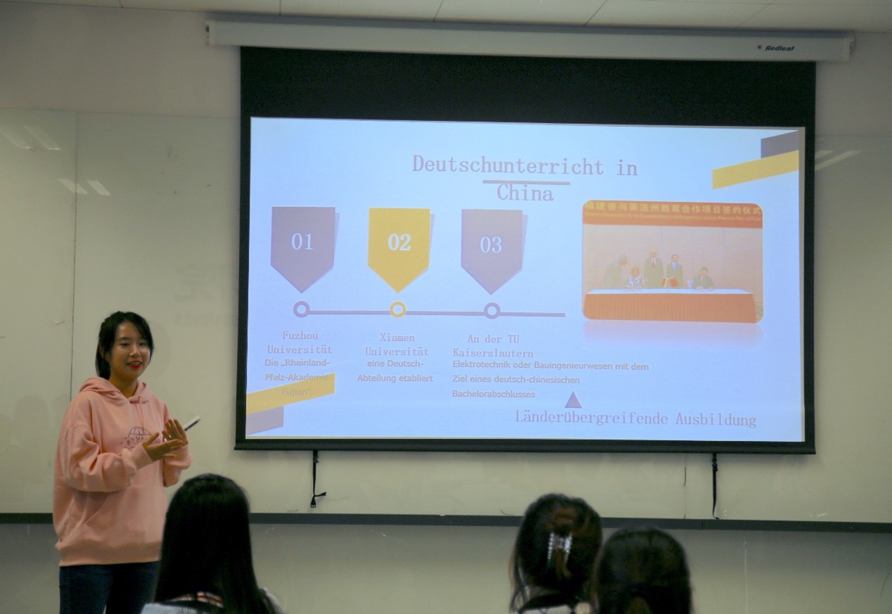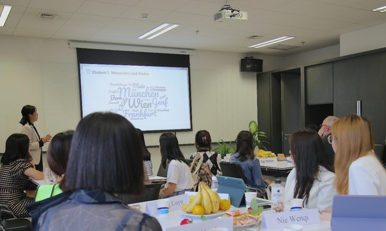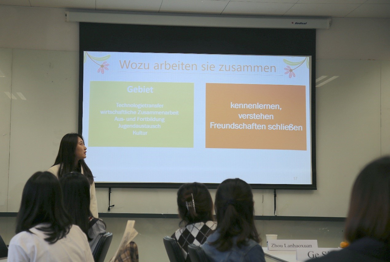 于芳副教授首先向到场的师生、校友和中外来宾表示了热烈欢迎,并简要介绍了必赢242net官网“德语国家概况课程”进行混合式教学的总体设计思路。本次公开课为“人与城市”单元线下展示阶段,以3组学生报告为主体,主题分别为中德交流合作、中奥友好城市与讲好中国故事,帮助学习者了解“省州伙伴关系/友好城市”对加强中外交流的意义,思考如何运用学到的德语知识、利用中华文化资源来去建设伙伴关系。