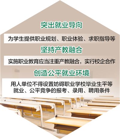 习近平总书记强调,在全面建设社会主义现代化国家新征程中,职业教育前途广阔、大有可为。目前,我国已建成世界上规模最大的职业教育体系,共有职业学校1.12万所,在校生超过3000万人。如何加快构建现代职业教育体系,培养更多高素质技术技能人才、能工巧匠、大国工匠?今起,“倾听”栏目推出“推动职业教育高质量发展”系列策划,关注各方实践和探索。 ——编 者 5月1日起,新修订的职业教育法正式施行。修订后的职业教育法将对推动职业教育高质量发展、提高技术技能人才培养质量、促进经济社会发展产生深远影响。 适应性更强—— 专业设置与产业需求同频共振 在北京电子科技职业学院汽车工程学院的实训室里,新能源汽车技术专业大二学生李新海正专心致志研究汽车构造。 左前大灯、玻璃水液位、雨量传感器……上百种汽车零部件井井有条地摆在白板上。李新海介绍:“白板后面有对应的按钮,一个按钮可以操纵一个零部件的故障。几百个故障点,我们要用检测仪器逐一判断。” 与李新海类似,很多学生往往还没毕业就被企业“预订”了。“高就业率的背后,是专业设置与产业需求的同频共振。”北京电子科技职业学院党委书记张启鸿说,“为适应区域主导产业的发展需求,学校增加了新能源汽车技术、飞机电子设备维修等7个专业。” 与产业发展紧密对接是职业教育的基本属性。随着我国进入新的发展阶段,产业升级和经济结构调整不断加快,各行各业对技术技能人才的需求越来越紧迫,职业教育的重要作用也愈发凸显。数据显示,在服务现代制造业、战略性新兴产业和现代服务业等领域,一线新增从业人员70%以上来自于职业院校毕业生,职业教育社会认可度显著提升。 为不断增强职业教育适应性,新修订的职业教育法增加规定:国家根据产业布局和行业发展需要,采取措施,大力发展先进制造等产业需要的新兴专业,支持高水平职业学校、专业建设。国家采取措施,加快培养托育、护理、康养、家政等方面技术技能人才。 “职业教育最重要的定位,就是为产业发展提供高素质技术技能人才。”南京工业职业技术大学党委书记吴学敏表示,作为全国首家公办本科层次职业教育学校,更应契合办学层次的提升要求,向以新兴产业、高新技术产业等为代表的高端产业转移。“目前,学校所有专业均对接江苏先进制造业和现代服务业,超过60%的专业对接江苏‘十四五’战略性新兴产业。”吴学敏说。 升学路更畅—— 打破止步于专科层次的“天花板” “职业教育是与普通教育具有同等重要地位的教育类型,是国民教育体系和人力资源开发的重要组成部分”,新修订的职业教育法开宗明义,作出重要判断——职业教育是“类型”教育,不是“层次”教育。类型教育的明确定位如同一根红线,串起职业教育改革的方方面面,许多难题得以破解。 ——打通职业教育人才成长“立交桥”。林晨是上海第二工业大学机械工程专业学生。“初中毕业后,我读了职校,后来通过贯通培养,升读大学本科。”林晨说,“我还想继续读加工制造专业硕士,今后从事机械加工相关工作。” 2019年以来,教育部批准设置了32所职业本科学校,打破了职业教育止步于专科层次的“天花板”。“下一步,我们要继续支持一批优质的高职专科学校独立升格为职业本科学校,指导符合条件的高职专科学校举办本科层次的职业教育。”教育部职业教育与成人教育司司长陈子季表示。 ——分类考试招生成为招生主渠道。通过职教高考,山东省东营市垦利区职业中等专业学校学生巴世豪进入山东交通学院继续深造。“我曾在全国职业院校技能大赛中获得二等奖,按照山东省政策,在职教高考中免考专业知识和技能。”巴世豪说。 新修订的职业教育法规定,高等职业学校和实施职业教育的普通高等学校应当在招生计划中确定相应比例或者采取单独考试办法,专门招收职业学校毕业生。如今,以“文化素质+职业技能”为主的职教高考,已成为职校招生主渠道,全国高职分类考试招生超300万人,超过高职招生总数的60%。 ——推行“学历证书+职业技能等级证书”制度。前不久,河南郑州市科技工业学校工业机器人技术应用专业学生司迁找到了工作。“我们学校是工业机器人操作与运维职业技能等级证书制度试点院校,毕业时还拿到了职业技能等级证书,让找工作更有底气、就业质量更高。” 通过学历证书夯实学生可持续发展基础,通过职业技能等级证书拓展学生就业创业本领,1+X证书制度是职校学生技能水平的重要凭证。据了解,目前教育部分4批遴选发布了300个培训评价组织的447个职业技能等级证书,证书累计获得超过1万家企业的认可,持证毕业生就业优势逐步显现。 发展劲更足—— 职业培训与职业学校教育并重 “如果没有继续上学,我可能还在老家务农,无法看见大山外面更广阔的世界。”贵州小伙秦龙江靠着在青岛做船员的收入,翻盖了老家的房子。 2015年,青岛海运职校与安顺民族职校结成对子,将船员培养作为合作方向,秦龙江就是毕业于航海捕捞专业。现在,他不仅能操控万吨巨轮航行海上,也成为家人的依靠。 与秦龙江相似,通过职业教育改变命运的人还有很多。据统计,我国职业院校70%以上的学生来自农村,许多家庭通过职业教育实现了拥有第一代大学生的梦想。 除学校教