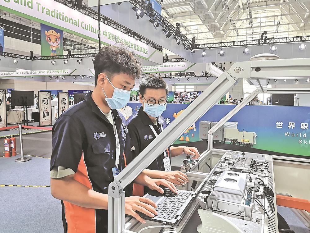 作为教育部批准成立的国内第一所应用技术大学,天津中德应用技术大学遵循“用高端装备、先进技术培养最优秀的人才”实践教学的理念,围绕制造业和制造服务业打造多类型、产教融合型“教学工厂”。图为在前不久举行的世界职业技术教育发展大会期间,天津中德应用技术大学参赛选手在交通运输赛项展区测试标定智能网联设备。 学校供图
