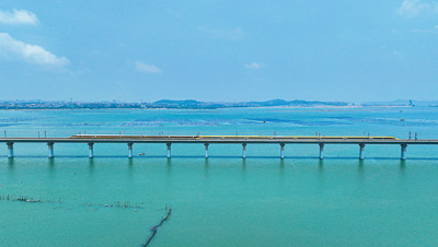 图为6月28日,福厦高铁湄洲湾跨海大桥,试验列车交会运行。