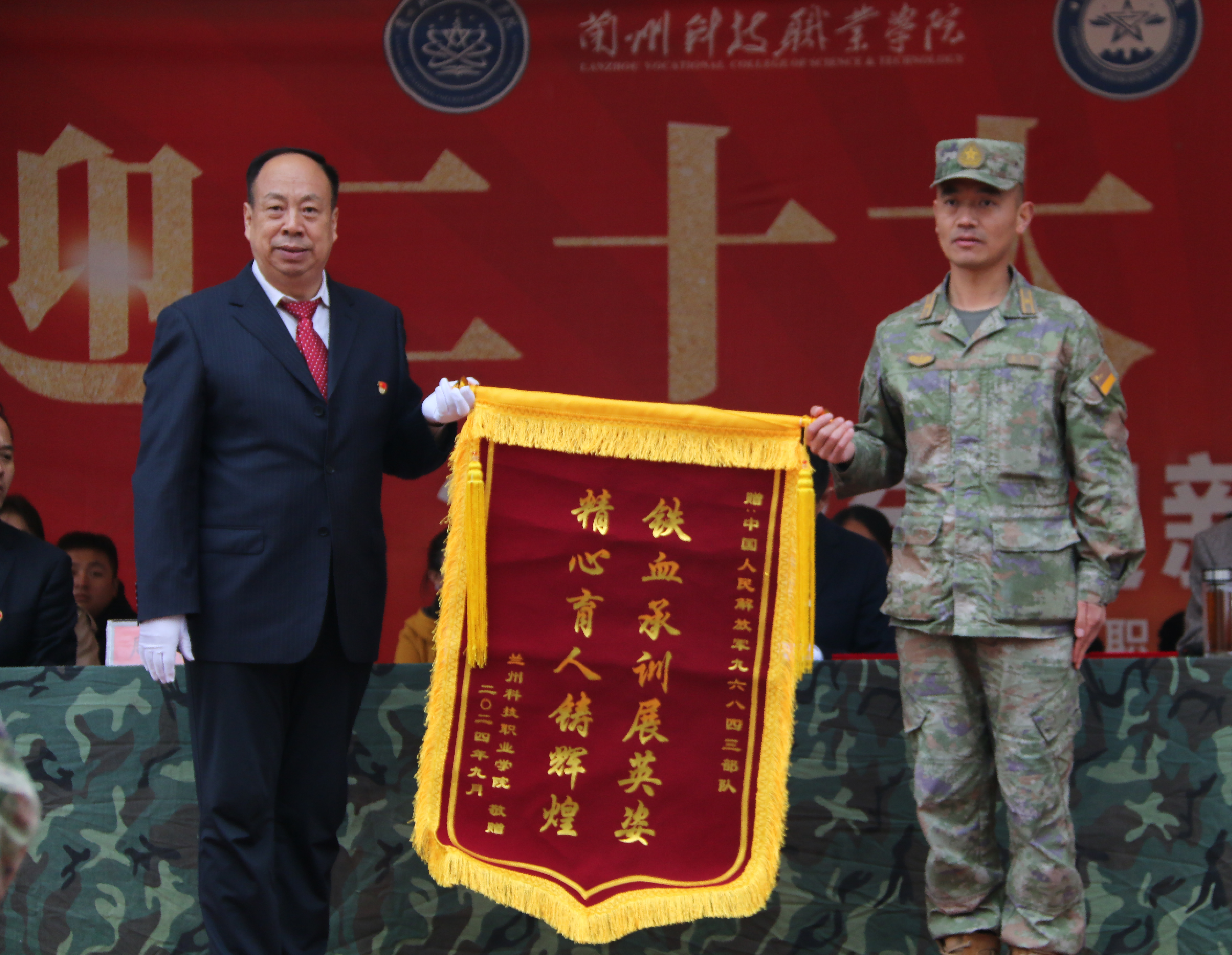 最后,学院党委书记温攀玺同志向中国人民解放军九六八四三部队赠送锦旗,以此表达学院对部队教官们在军训期间无私奉献、辛勤指导的崇高敬意和衷心感谢。党委副书记、常务副院长孟光宣读表彰决定,向优秀学员和优秀教官颁发了荣誉证书。