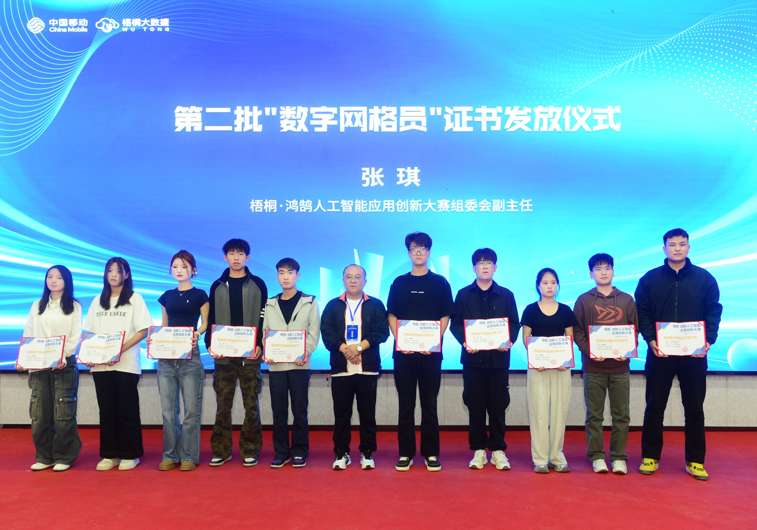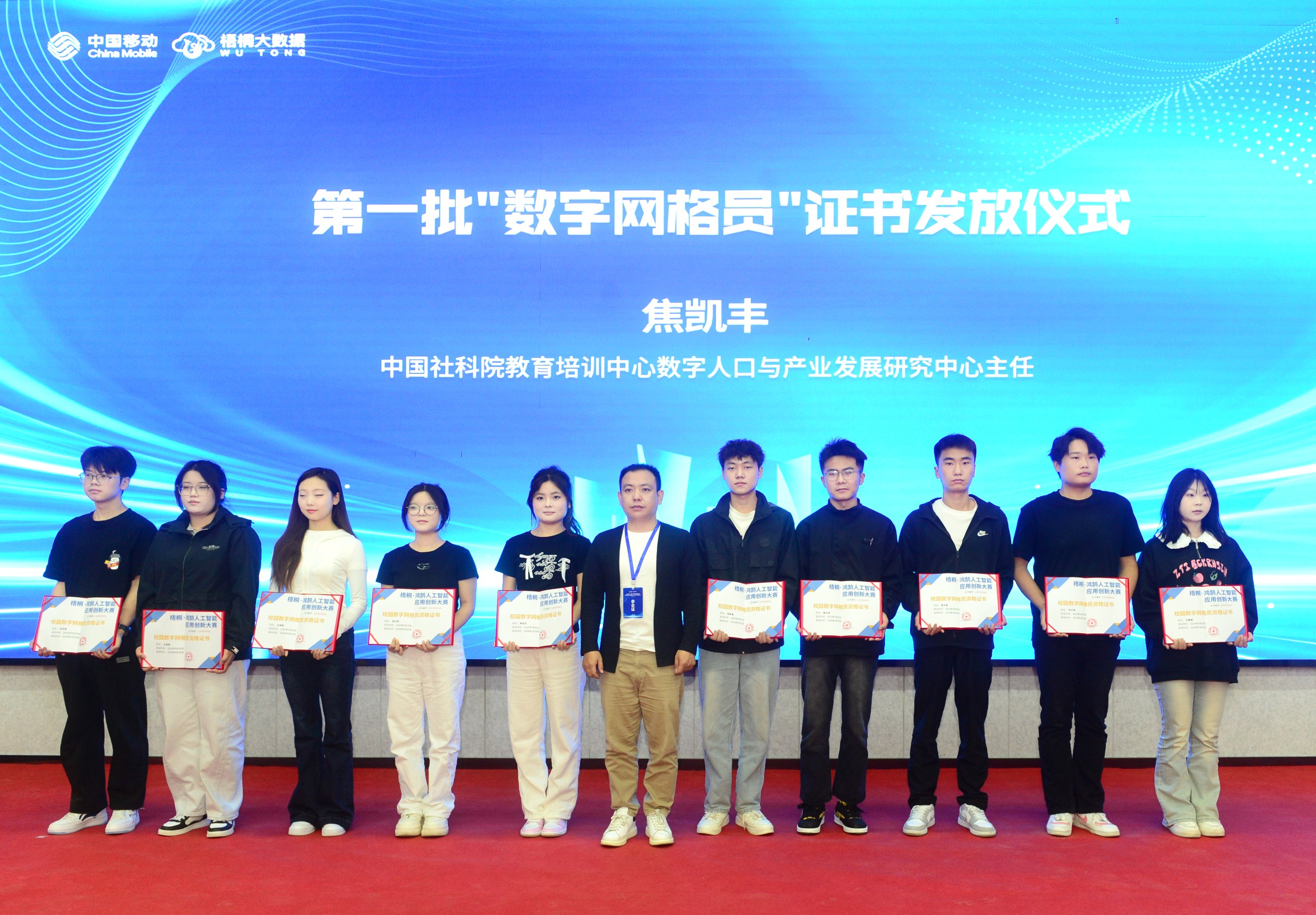 同时,中国社科教育培训中心数字人口与产业发展研究中心主任焦凯丰先生和梧桐·鸿鹄人工智能应用创新大赛组委会副主任张琪先生,现场为20名经过严格遴选的首批“数字网格员”颁发了证书,他们将承担社区数字化服务的桥梁角色。
