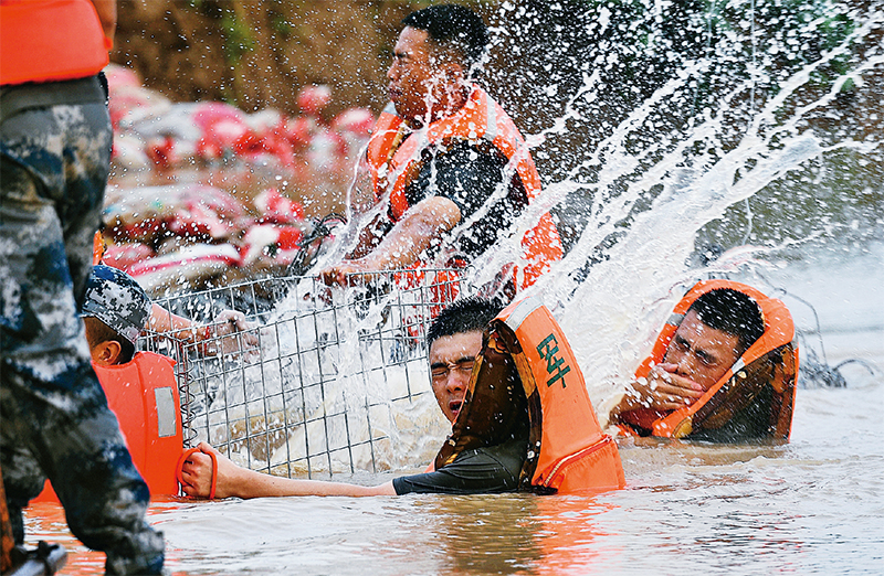 图为2021年7月22日,在河南省开封市贾鲁河小岗凹河段,空降兵某旅官兵跳入齐胸深的洪水中加固堤坝。 新华社发 余红春/摄