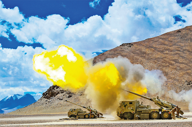 初夏时节,陆军某火力团展开多火器跨昼夜实弹射击演练。图为某新型火炮实施远程火力打击。 陈明/摄
