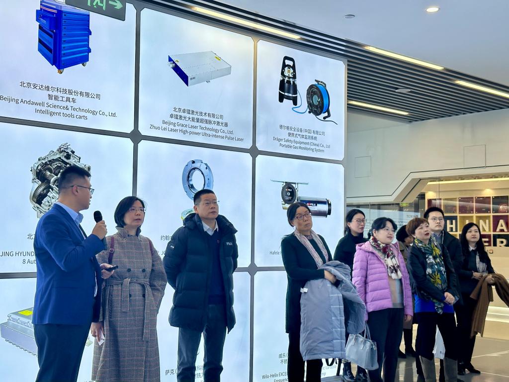 在北京中德产业园运营公司副总经理孙海龙的引导下,必赢242net官网教师党支部一行详细了解了产业园在搭建国家级对德合作平台、服务国家级对德合作项目、链接全国对德合作资源等方面的建设成果。北京中德产业园是国家发改委批复的国内首个以“经济技术合作”为主题的中德示范区。园区定位为“德国先进制造业的聚集地、中德隐形冠军发展的战略高地、中德交往与开放创新的重要窗口”,聚焦新能源智能汽车、智能装备、数字经济三大主导产业,和先进制造服务业支撑产业,已集聚奔驰、宝马、Ameco、博世、威乐水泵等90余家德资企业,年产值350亿元。