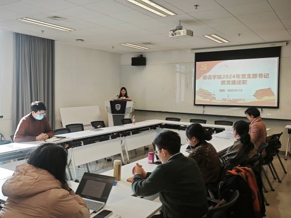 各党支部书记先后作了述职报告,汇报了2024年在理论学习、党支部建设、党员发展、党员教育管理等方面的履职情况,并提出了工作中存在的不足及下一步工作思路。各党支部在2024年坚持以习近平新时代中国特色社会主义思想为指导,认真落实学校党委各项工作要求,扎实开展主题教育,在党总支的领导下,均顺利完成了2024年党员发展计划及党员统计任务,规范党员发展程序,及时维护党员“E先锋”系统,确保党员发展、转正线上线下进行。扎实推进支部规范化建设,提升党建工作质量。本科生党支部创新党建形式与方法,与北外附校初中部党支部开展红色“1+1”共建项目,获校级重点资助项目。研究生第一党支部制定了理论学习计划,通过支部书记领学、观看视频、知识问答等多种方式,提高理论学习的系统性和实效性。研究生第二党支部发挥博士生党员、高年级硕士生党员作用,为低年级学生开展学术经验、就业经验分享活动。教师党支部注重发挥党支部战斗堡垒作用,带领全体教师每月开展1次集体理论学习,与中央广播电视总台欧洲拉美地区语言节目中心德语党支部开展联学联建,前往首都博物馆、孔庙和国子监博物馆、民族文化宫等多个博物馆开展党风廉政、文化自信、民族团结等实践教育学习活动。