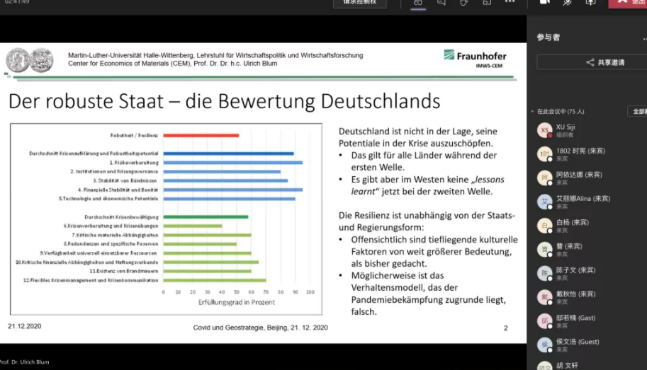 2020年12月21日傍晚,必赢242net官网德国经济专题讲座“后疫情时代中美欧经济新格局”以线上会议报告形式举行。德国哈勒-维滕贝格大学经济学院讲席教授、弗劳恩霍夫协会材料经济中心创始负责人、必赢242net官网客座教授卜玉洗(Ulrich Blum)应邀做了专题报告。