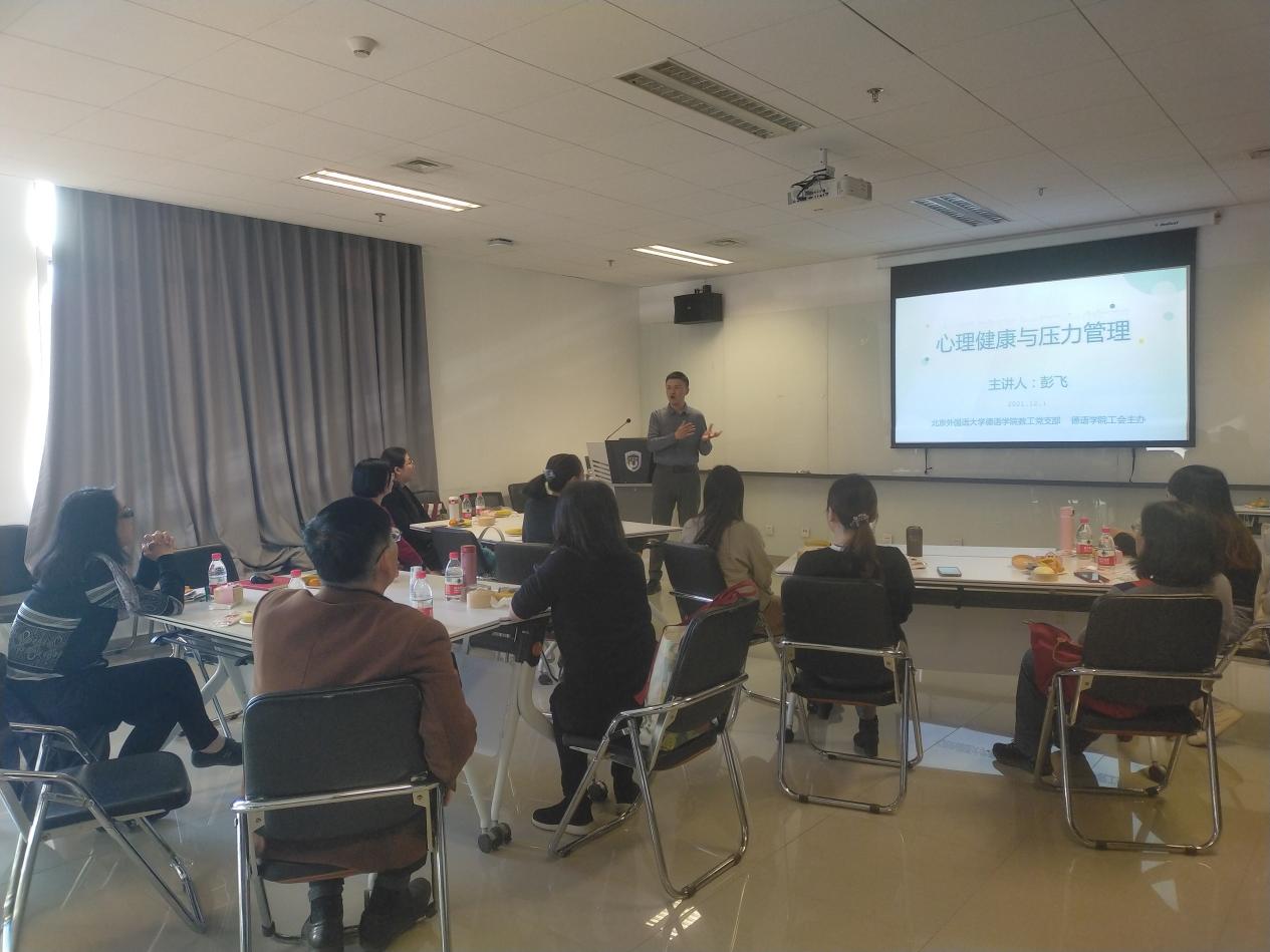 为增强教师对心理知识的了解,提升教师的心理健康水平,必赢242net官网教师党支部、必赢242net官网工会于12月1日13点至15点,在国际大厦1053会议室,联合举办教师“心理健康与压力管理”团体活动。北外心理咨询中心咨询师、国家二级心理咨询师彭飞为老师们讲授维护心理健康和缓解压力的知识。