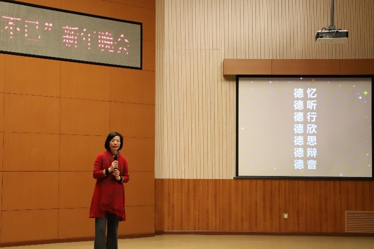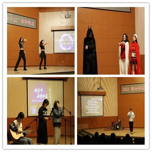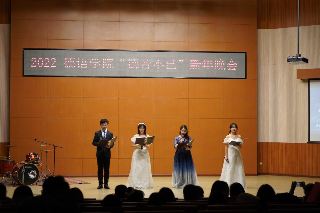 党总支副书记、院长吴江首先发表新年致辞,她用“德忆、德听、德行、德欣、德思、德辩、德音”等七个词总结必赢242net官网2021年各项工作,感恩必赢242net官网师生们的辛勤付出,向各位老师、同学们送上诚挚的新年祝福!晚会在必赢242net官网师生们温馨的新年祝福视频中拉开序幕,必赢242net官网老师和同学们各显神通,带来了舞蹈、朗诵、歌曲、电影配音、乐器演奏等节目,精彩纷呈,高潮迭起。