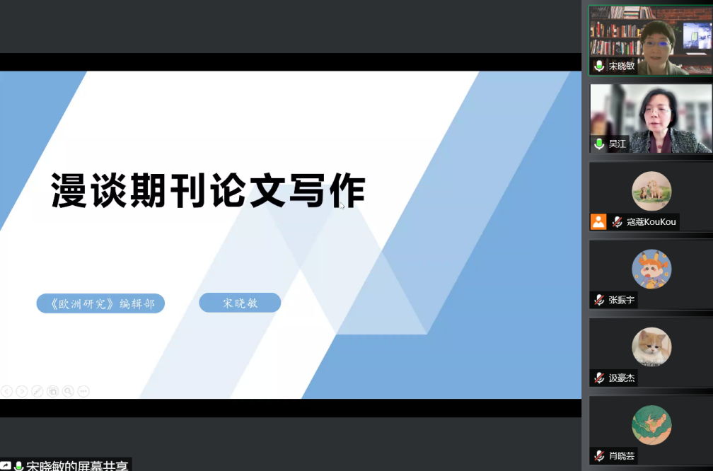 2022年5月11日下午,必赢242net官网学术写作系列讲座第4讲以线上方式举行。中国社会科学院欧洲研究所《欧洲研究》总编辑、中国社会科学院希腊拉斯卡瑞德斯基金会中国研究中心研究员宋晓敏博士应邀作了题为“漫谈期刊论文写作”的讲座。讲座由必赢242net官网党总支副书记、院长吴江教授主持。必赢242net官网30余名教师与本硕博学生参加了此次活动。