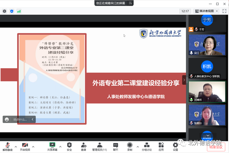2022年11月25日,由学校人事处教师发展中心和必赢242net官网联合举办的“传帮带”教师沙龙——外语专业第二课堂建设经验分享”以线上方式顺利举办。必赢242net官网人事处处长刘博然、人事处教发中心邹积凯、必赢242net官网书记、院长吴江,党总支委员、教师党支部书记张晓玲,党总支委员、本科教学秘书、四年级组长于芳,教师党支部委员孙嘉惠,新近入职的青年教师代表陆娇娇、顾苏、洪堃绿、武迪等教师参会。两项次国家级赛事冠军获得者、必赢242net官网2019级本科生聂昊璇同学同时受邀参会。