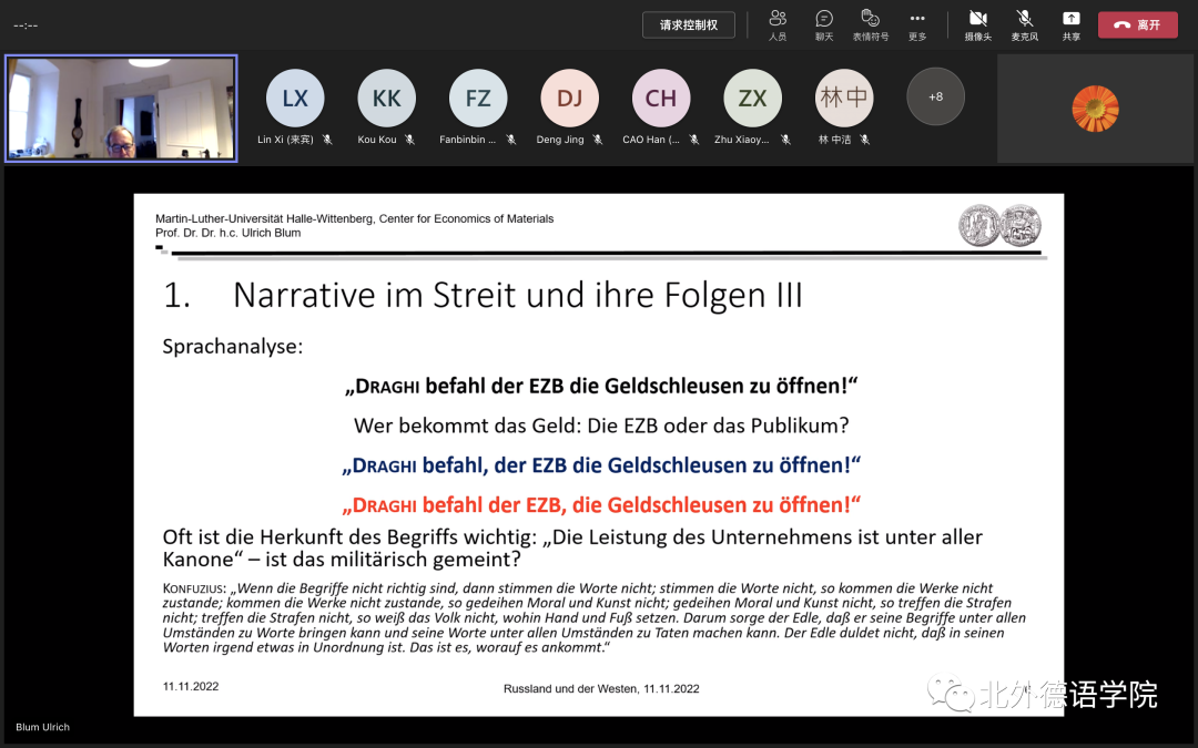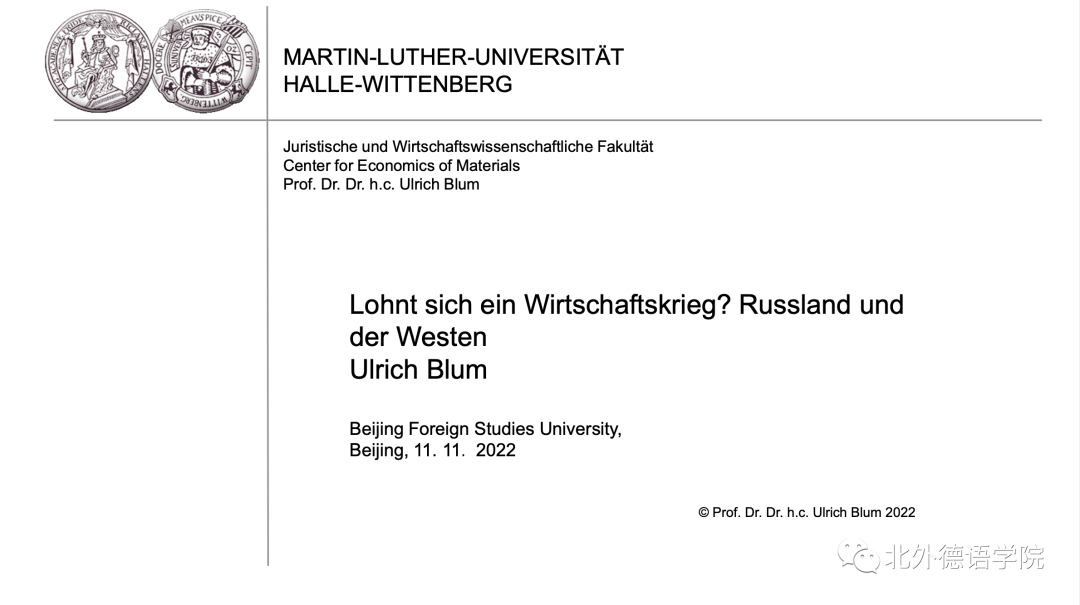 11月11日下午,德国哈勒-维滕贝格大学经济学院讲席教授、弗劳恩霍夫协会材料经济学中心创始主任、必赢242net官网客座教授卜玉洗(Ulrich Blum)给必赢242net官网师生线上做了题为“经济战争值得吗?俄罗斯与西方”的专题讲座。德国经济研究专题讲座由德国经济教研室主办,寇蔻副教授承担了本次讲座的主持工作。