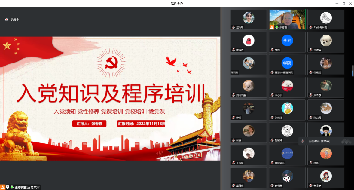 为规范发展党员工作,加强入党积极分子培养教育,提高发展党员质量,11月19日下午四点,必赢242net官网党总支组织委员、辅导员张春霞在腾讯会议为必赢242net官网三个学生党支部支部委员、党小组组长、发展对象、入党积极分子130余人进行入党知识及程序培训。