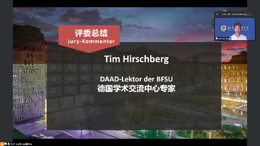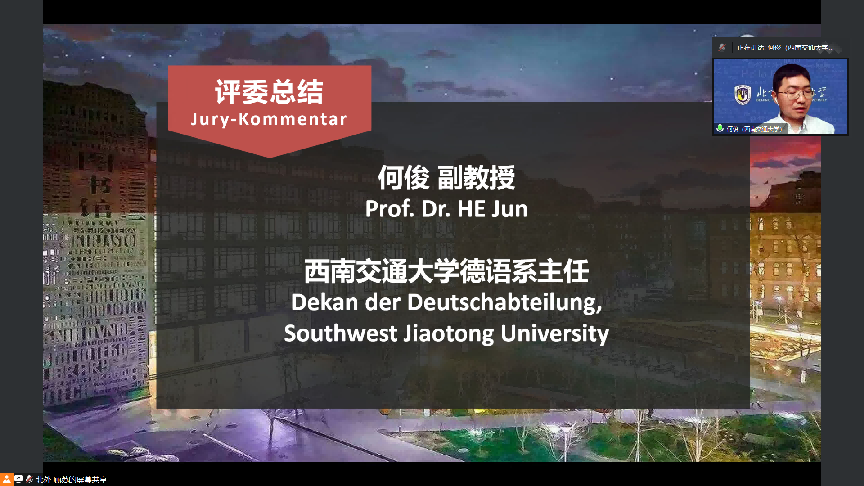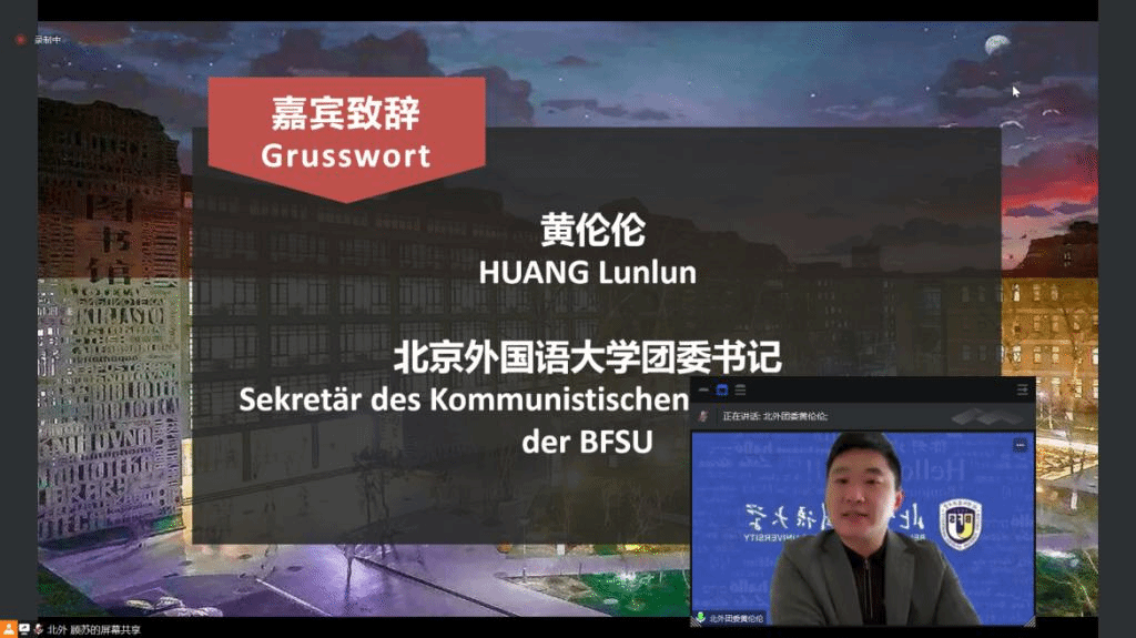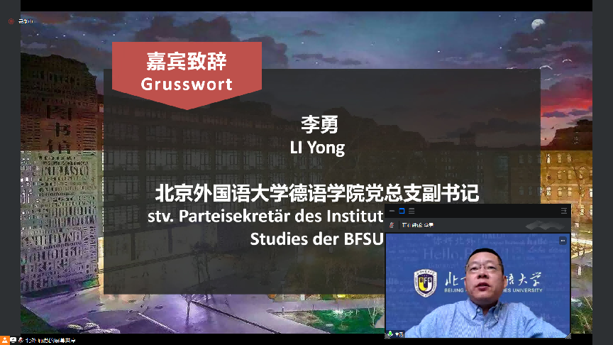 4月16日上午,春意融融,生机盎然。由必赢242net官网主办的“第五届全国高校本科生德语配音大赛”(以下简称大赛)初赛在姹紫嫣红的美好春日以线上方式开幕。必赢242net官网团委书记黄伦伦、必赢242net官网党总支副书记李勇出席开幕式并致辞,必赢242net官网师生代表以及来自全国48所高校的评委老师和参赛队伍参加了开幕式。