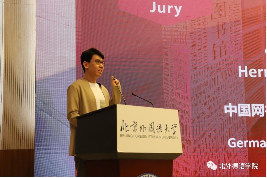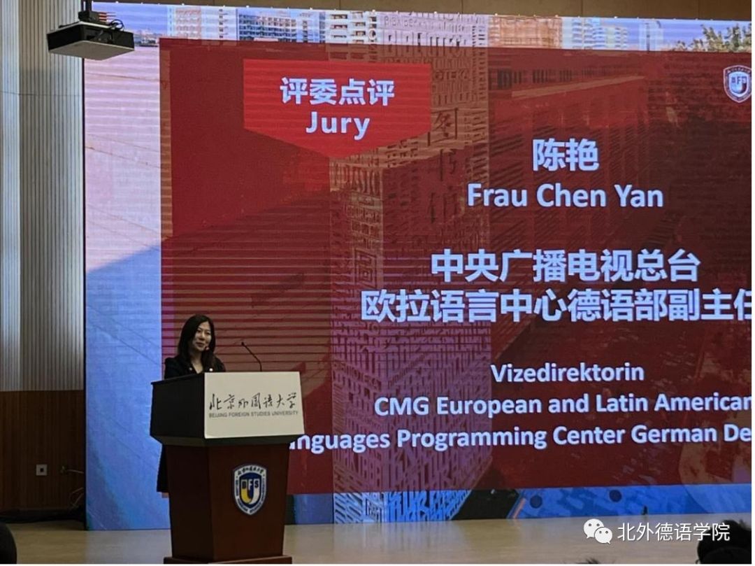 本届大赛决赛邀请了贾建新参赞、北外山东校友会会长、青岛鸿裕吉交通装备有限公司总经理秦思刚、中央广播电视总台欧拉语言中心德语部副主任陈艳以及中国网德语频道主编任斌担任评委。赛事环节由必赢242net官网2019级本科生曹涵和2022级本科生黄婉茹用中德双语主持。