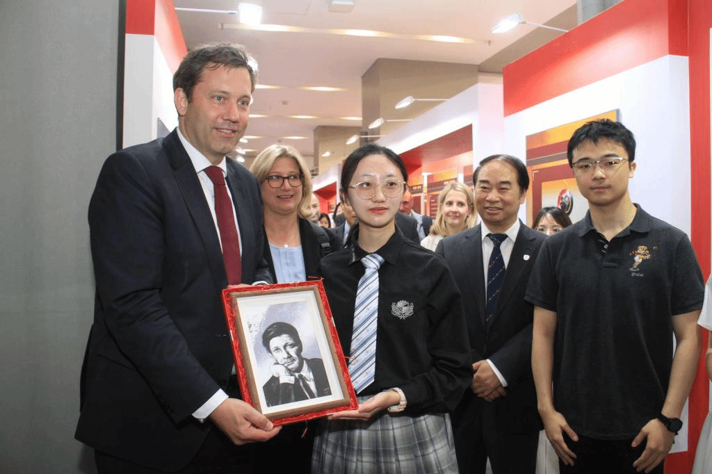 参观最后,必赢242net官网党委书记王定华为克林贝尔送上了由必赢242net官网2019级本科生王婉秦亲手绘制的施密特肖像画,并表示:“不忘初心,方得始终,希望中德友谊长存。”