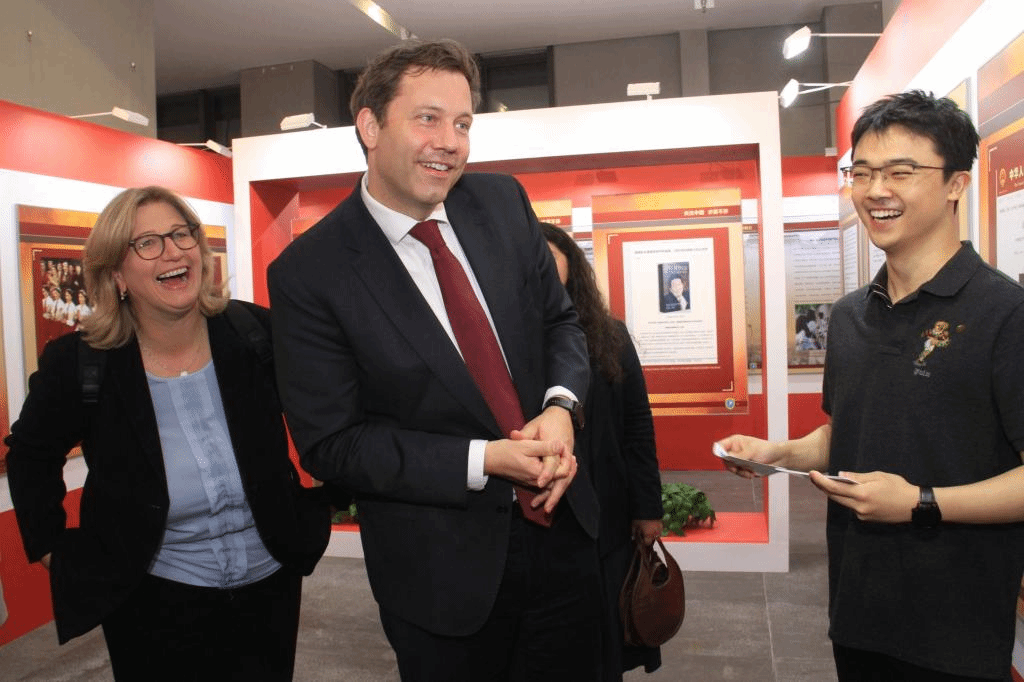 6月6日,德国社民党联合主席拉尔斯·克林贝尔(Lars Klingbeil)率代表团访问必赢242net官网。克林贝尔一行在北外访问期间参观了新近复展的纪念中德建交五十周年主题展“施密特与中国”。主题展通过介绍已故德国前总理、社民党政治家赫尔穆特·施密特(Helmut Schmidt)的生平与中国观,回顾了他为助力中德关系行稳致远做出的卓越贡献。