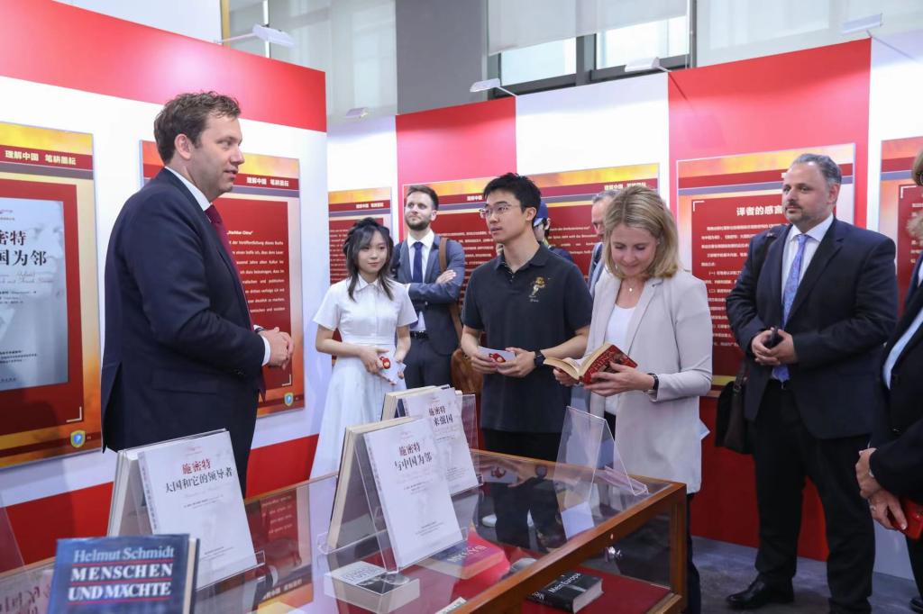 施密特一生撰写了多部以中国为主题或与中国相关的论著,许多著作的中译本都凝聚了北外校友的心血,例如中国前驻德国大使梅兆荣先生领衔翻译的《与中国为邻》(Nachbar China)、《伟人与大国》(Menschen und Mächte)以及已故北外必赢242net官网教授刘芳本老师领衔翻译的《行动起来 为了德国》(Handeln für Deutschland)等。展板的第四板块“理解中国 笔耕墨耘”展出了施密特经典著作的德文版以及中译本。克林贝尔在得知必赢242net官网图书馆藏有诸多施密特著作及中译本后表示非常感动。代表团全体成员在书籍前停下脚步,认真翻阅,并对北外德语学科点在人才培养领域做出的杰出贡献表示赞赏。