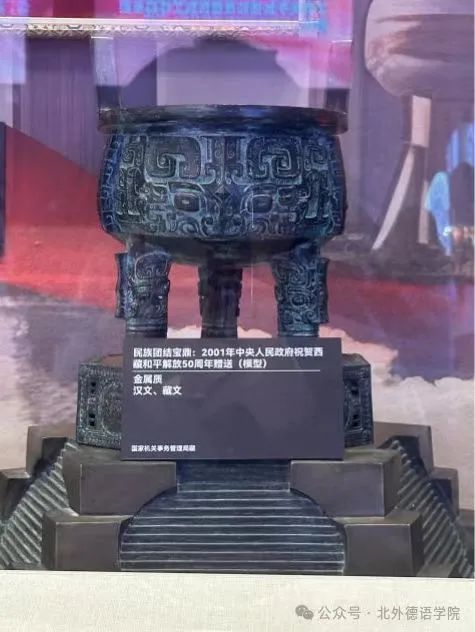 民族团结宝鼎:这是2001年中央人民政府为祝贺西藏和平解放50周年而赠送的珍贵礼品。宝鼎造型庄重典雅,寓意深远,象征着中华民族的大团结和共同繁荣。宝鼎上的纹饰精美细腻,既体现了中国传统文化的精髓,又融入了西藏独特的民族元素。这件展品不仅是对西藏和平解放50周年的庆祝,更是对藏族与汉族之间长期友好交往的肯定。它如同一座灯塔,照亮了中华民族团结奋斗的道路,引领着我们共同迈向更加美好的未来。